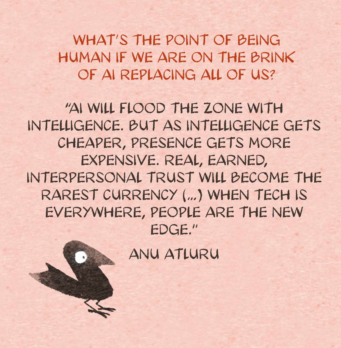 There’s a hand behind every line, and you feel it. That’s not an accident. It’s a philosophy. Because as we talk about in the show, as non-human intelligence becomes cheaper, the human touch—and real, earned, interpersonal trust—will become the rarest currency (to paraphrase Anu Atluru’s quote below).