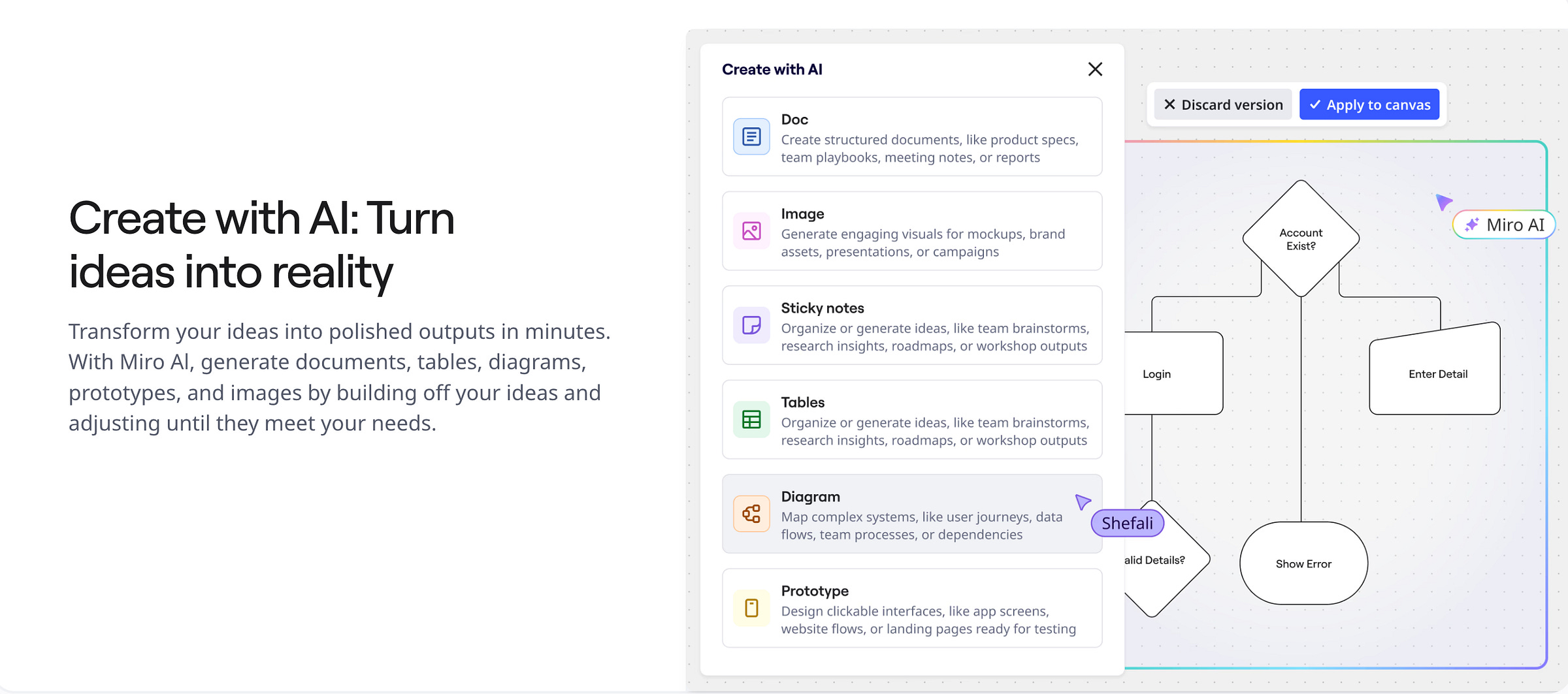 Miro AI can turn unstructured data—like sticky notes or screenshots—into usable diagrams, product briefs, data tables, and prototypes in minutes. You can also generate roadmaps, diagrams, tables, content, and more with Miro AI, dropping it all into a collaborative canvas.