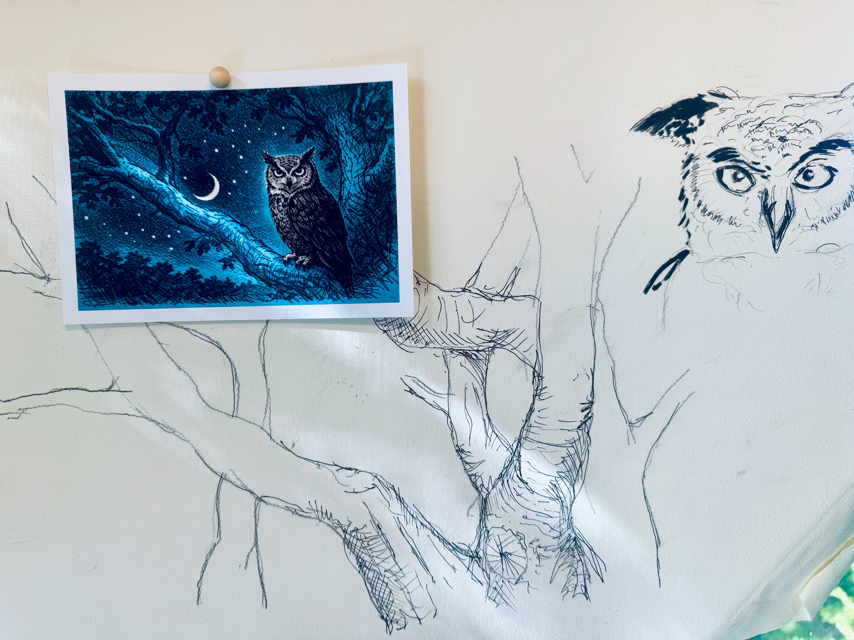 It wasn’t until I went back and re-listened to the interview that I realized what the sketch was referring to. At one point, Austin spoke about owls, and how they probably never think about being owls, they just are. Similarly, if we can embrace our own “creatureliness,” we might be able to access creativity that otherwise would remain locked away.