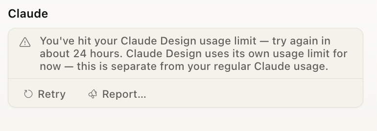 The more interesting operational quirk: Claude Design is metered on its own allowance, separate from the rest of your Claude usage. In our experiments redesigning a personal website home page (yes, just one page), that allowance burns down alarmingly fast. We hit the wall on a typical Pro session and got this friendly little error for our trouble: